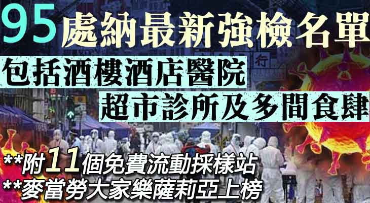 政府引用《預防及控制疾病(對若干人士強制檢測)規例》(《規例》)(第599J章),就《規例》下的強制檢測公告刊憲,要求於指定期間曾身處95個指明地方的人士(下稱「受檢人士」)接受2019冠狀病毒病核酸檢測。
