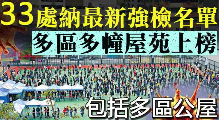 因應多宗初步陽性檢測個案或陽性檢測個案,有33個指明地方被納入強制檢測公告。政府會在個別指明地方上門拍門通知有關居民強制檢測的要求,並已在各區設立流動採樣站,便利他們根據強制檢測公告的要求接受強制檢測。即使是已經接種疫苗的人士亦必須接受上述強制檢測。他們應同時密切留意身體狀況,就算只有輕微病徵亦必須立即求醫並接受檢測。