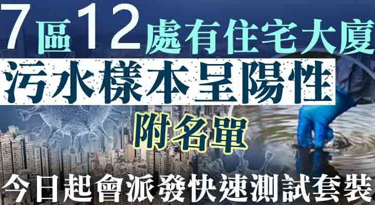 為跟進在深水埗、沙田、大埔、元朗的污水檢測呈陽性的結果,民政事務總署(包括深水埗、沙田、大埔、元朗民政事務處)將會由今天(23日)起陸續向以下地區的住戶及工作的每位清潔員工及物業管理員工派發快速測試套裝,供他們自行檢測,以輔助識別感染者。