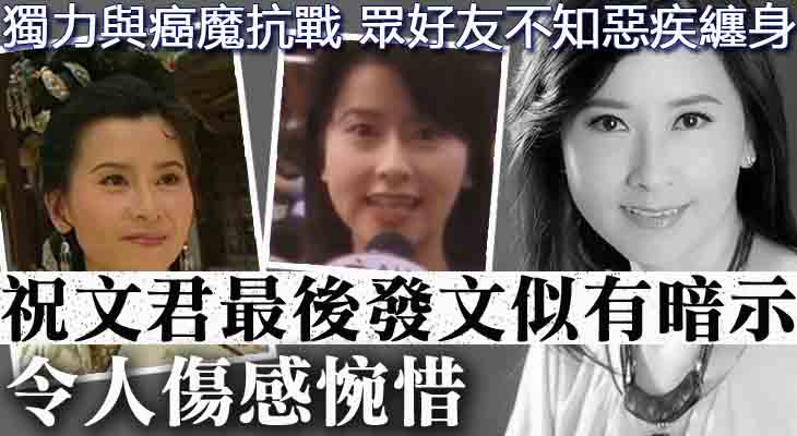 據悉,大部分好友都不知道祝文君身患惡疾,自己一直獨力與癌魔抗戰。很多圈中朋友得悉她的死訊都大感愕然。