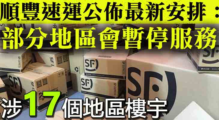 順豐現時已暫停所有隔離中心、社區治療設施、過去14天内曾有確診個案的樓宇及有關指定地區樓宇的上門收派服務。指定地區樓宇來自包括觀塘、葵涌、沙田、大埔、粉嶺、上水、元朗、天水圍、屯門、大嶼山、美孚、大角咀、土瓜灣、黃大仙、觀塘、西貢及佐敦等,詳情可前往順豐網站查閱。(詳情按此)