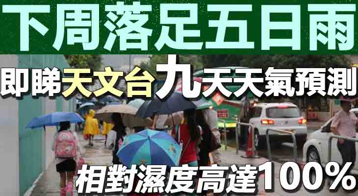 未來九天天氣預測,好幾天的相對濕度都可高達100%,由下周三起更落足五日雨,大家記得要帶備雨具!