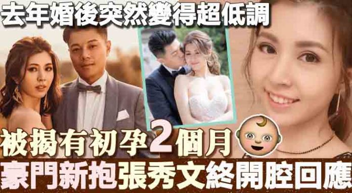 近日有消息指這位豪門新抱跟老公傳來好消息,報道指二人「造人」成功。有指張秀文現有身孕約兩個月,不過由於未足三個月怕BB「小器」,有指張秀文對初孕一事封嘴。