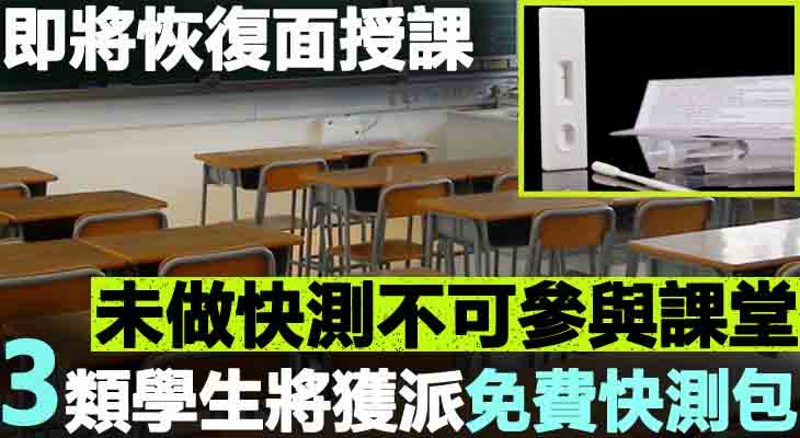 特首林鄭月娥日前公佈,復課後將要求教職員每日進行快速檢測,政府為向全港學校派發1,000萬套快測包;未打針學生不可參與課堂以外的非學術活動。