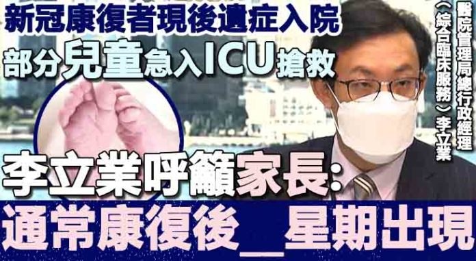 醫院管理局總行政經理(綜合臨床服務)李立業表示有新冠康復者出現後遺症,當局早前接獲15宗多系統發炎綜合症個案,相信是由於病毒感染,誘發免疫系統導致發炎,通常康復後2至6星期出現。