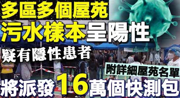 政府表示,為應對嚴峻的新冠疫情,環境保護署與渠務署連同香港大學跨學科團隊近日已加強在各區採集污水樣本進行冠狀病毒檢測,並發現於多個地區檢測到污水呈陽性的結果,顯示該地區的處所可能有隱性患者存在。