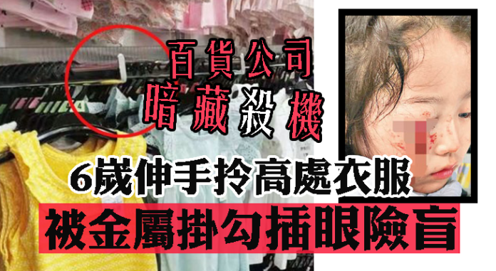 澳洲雪梨一名6歲女童在逛百貨公司時發生意外,當她伸手拿一件掛在高處的衣服時,結果失去平衡摔倒,撞向掛衣服的金屬掛勾,直接插入右眼,幸好沒有傷及眼球,但眼窩的肌肉與神經造成永久傷害。