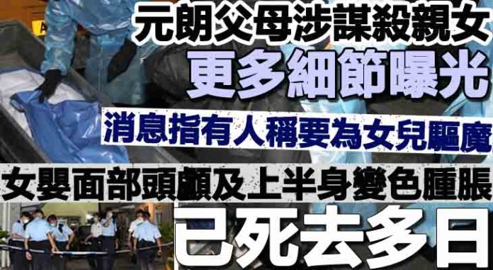 警方破門而入,發現單位內女嬰仰臥睡房地上,全身被一條毛巾及一袋紙尿片覆蓋,當場證實死亡。警方以「謀殺」罪拘捕懷疑涉案的女嬰父母,案件交由元朗警區重案組跟進。