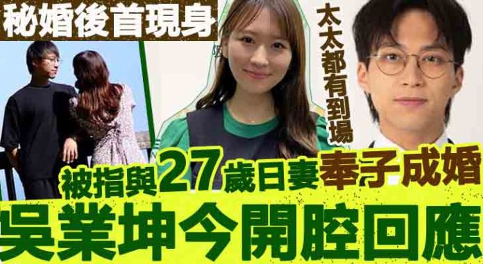 32歲吳業坤(坤哥)早前身在日本,今年5月初他突然在社交網宣佈已秘婚,他又上載與太太合照,但一頭長髮的吳太只見到背面,身形纖瘦,坤哥一臉情深望著太太;還有他們各拿著四葉草的照片。