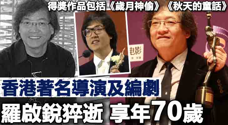 香港著名導演及編劇羅啟銳辭世,享年70歲。據說羅啟銳一直心臟有事,近年看中醫治療,於昨天猝逝,田啟文今日在短訊中證實死訊:「是真的!」他透露羅導離世時女友張婉婷亦有陪伴在身邊,張婉婷則未有接電聽電話。