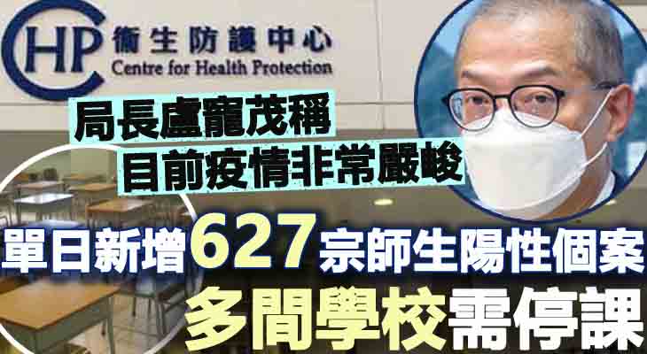 學校方面,當局今共接獲627宗陽性個案,包括527名學生及100名職員,涉及454間學校,個案分別來自101間幼稚園、301間小學、213間中學、及12間特殊學校。