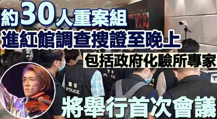 西九龍總區(刑事)警司鍾雅倫率重案組約30人下午約3時到紅館調查,政府化驗師亦於下午約4時半抵達紅館。