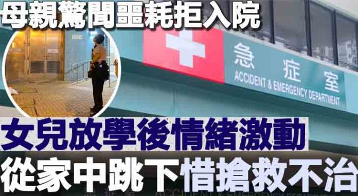 凌晨零時許,警方接獲一名女子報案,指其女兒於家中窗邊危坐,家人一度喝止惟不成功,女子突從家中跳下,重創倒地,地上遺下血漬及屬於女事主的一對鞋。