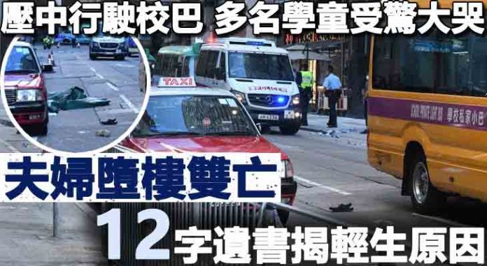 二人登上聯威新樓23樓天台一躍而下,壓中一輛停泊在路邊的的士及一輛駛經的校巴,多名學童受驚大哭。