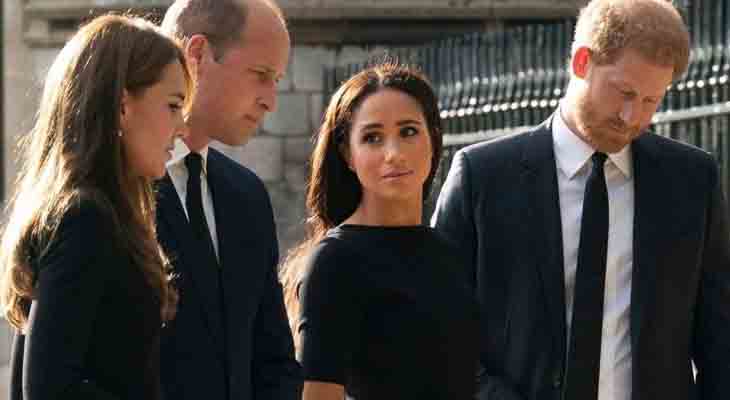 查理斯與一眾皇室成員逐一來到白金漢宮,將在教堂內守靈。有媒體從窗外拍到查爾斯國王、哈里王子和梅根罕見的同框畫面,哈里牽著梅根的手,走在國王後面。