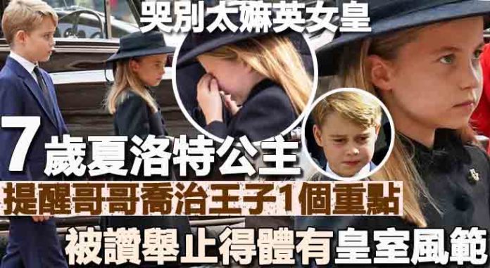 在長達1小時的儀式中兄妹倆和父母威廉、凱特坐在第一排,得體沉穩的表現廣獲讚賞。哥哥喬治王子穿著海軍藍西裝,繫著黑色領帶,而妹妹夏洛特身穿黑色洋裝、戴著帽子,胸前的馬蹄鐵形鑽石別針引人注目,這是英女皇生前送她的禮物,她第一次戴著貴重首飾亮相,此時佩戴別具意義。