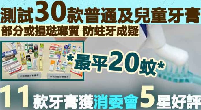 消委會公布最新檢測結果指,市面30款普通和兒童牙膏中,部分樣本酸鹼值和氟含量太低,未能符合內地標準,或損害琺瑯質,預防蛀牙效用成疑。