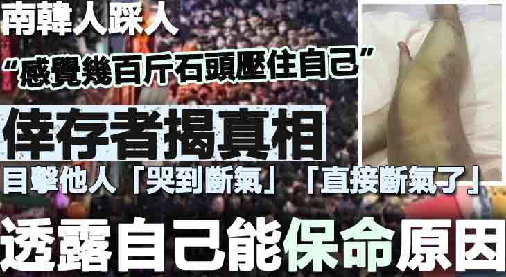 她指當時後方的人群一直往前擠,而前方倒下的人則已不治,並透露由於自己個子高故還能伸著脖子呼吸,而右方個子矮的女生則「直接嚥氣(意思:斷氣)了,就在我旁邊」,右後方的外國男生則是直接吐在她身上,前方的女生則一直哭泣,直到哭著嚥下最後一口氣。