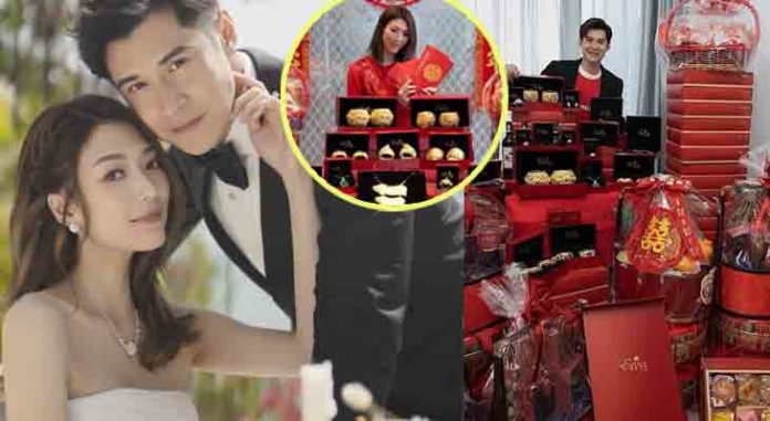 近日舉行過大禮儀式,二人在社交平台曬過大禮的禮品,相當震撼!照片中,看到一串5隻的大金豬牌外,還有7對龍鳳鈪,其中有幾對是重型「流星錘」,還有多套首飾:頸鏈、耳環與手鏈等,還有嫁女餅與山珍海味等禮品等。目測約有30盒嫁喜禮盒,相中的嫁喜禮餅疊高後,站在身後的180cm高的陳家樂還要高,多得要把部分放在地上。