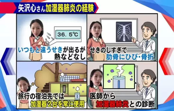 經過醫生檢查和X光檢查後,矢沢心驚訝地發現,因為過度劇烈的咳嗽,她的右側兩根肋骨和左側一根肋骨出現了裂痕和骨折。最終,醫生診斷她患上了「支氣管肺炎」和「過敏性肺炎」,認為這可能與她在旅館使用的加濕器有關,導致她感染了「加濕器肺炎」。矢沢心提到,骨折的疼痛加上不斷的咳嗽,讓她的生活變得非常痛苦。
