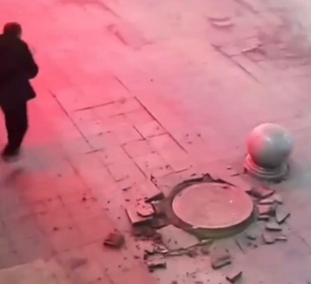 僅僅幾秒鐘後,下水道裡突然傳來一聲巨響,沼氣被鞭炮瞬間點燃,引發了劇烈的爆燃。強大的爆炸衝擊波如同一頭猛獸,瞬間將井蓋掀飛。而此時,女孩剛好跑到了另一個井蓋上,爆炸的衝擊力直接將她和井蓋一同炸上了天。在監視器畫面中,女孩的身影瞬間消失,周遭的人都被這突如其來的變故嚇得呆立當場。