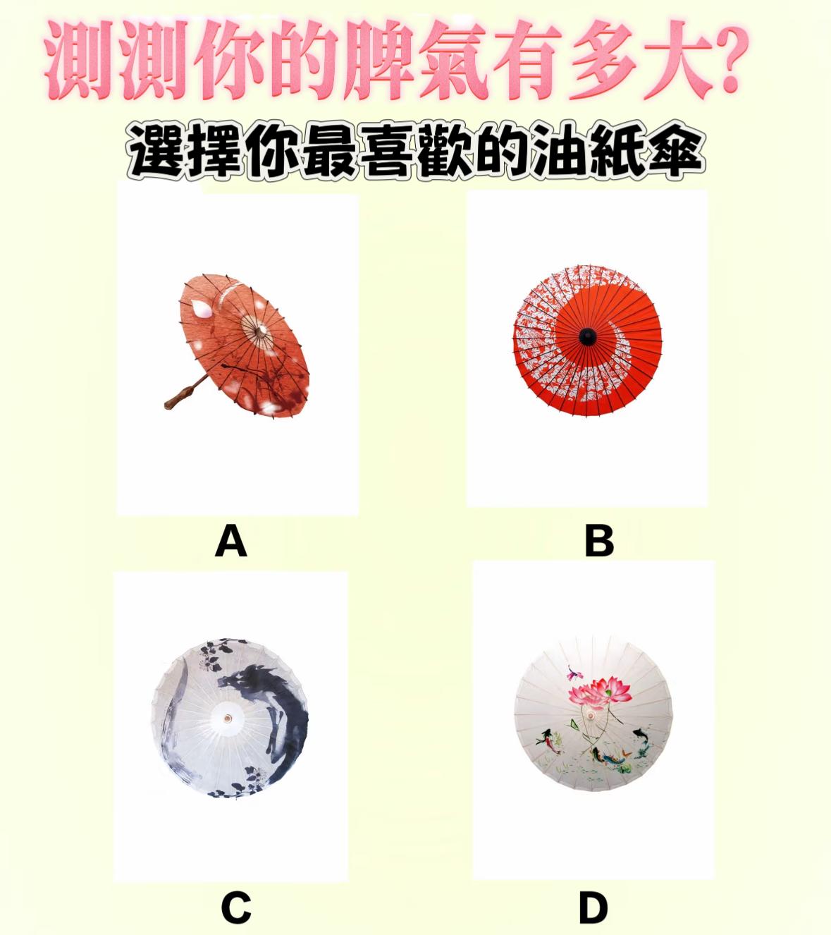 選擇黑白色雨傘,象徵你脾氣內斂而深沉,一旦底線被觸,爆發力不容小覷。日常中,你避免無謂爭執,常顯冷靜沉穩,但內心對原則堅守不渝。若有人跨越界限,你會果斷展現強烈反應,讓對方深刻體會你的決心與力量。銘記【心若寬廣,怒氣自消】,為自己招來更多福澤!