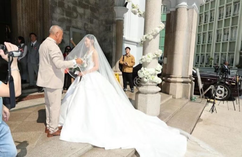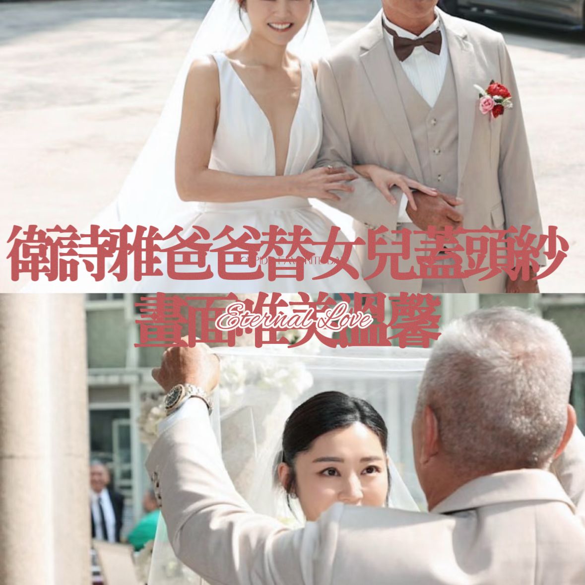 婚禮開始時,由爸爸與女兒衛詩雅站在教堂之外,在蓋上頭紗的一刻,陽光映照在衛詩雅的臉上,顯得她份外美麗動人。爸爸與女兒衛詩雅相對而望蓋頭紗,衛詩雅更說了一句:「好想喊呀。」隨著音樂響起,爸爸就拖著女兒衛詩雅慢慢步入,現場賓客紛紛舉起手機拍攝留住動人一刻,以及送上祝福,畫面溫馨而又浪漫!