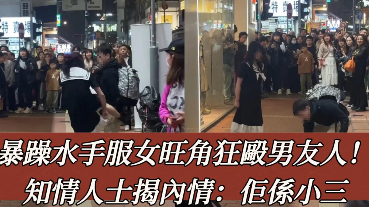 近日網上瘋傳一段旺角街頭疑似情侶吵架,女生繼而出手打人的片段。片段開頭已見二人被多名途人圍觀,當時水手裙女生穿在地上,男生湊近似乎想拉起女生,不過女方情緒激動地咆哮。接下來見到女方拳打腳踢男子,用力之猛連黑鞋亦飛脫,期間男子一直保持情緒穩定。有疑似知情的網民留言,透露片中二人關係。