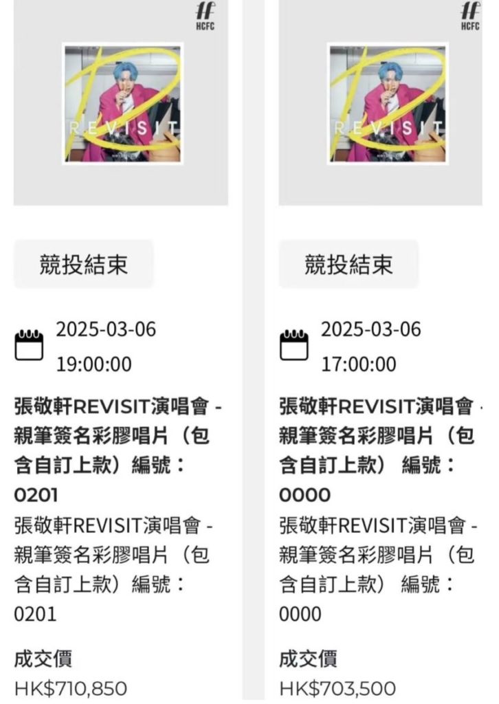 不過,軒公昨(6日)就在社群網分享,由他親筆簽名的2022年REVISIT演唱會黑膠唱片,兩張編號0201及0000,竟分別投出逾70萬的天價數字,嚇不少粉絲,就連軒公也被嚇親,並認為偏離他的初衷,拍賣品投得。