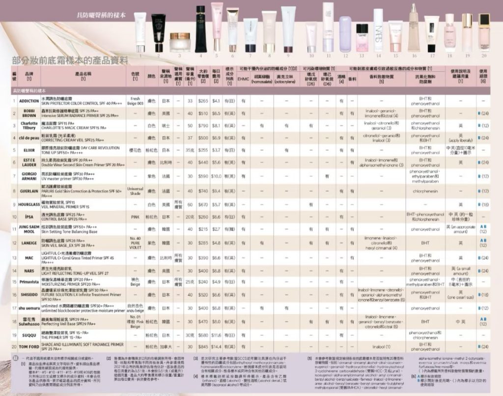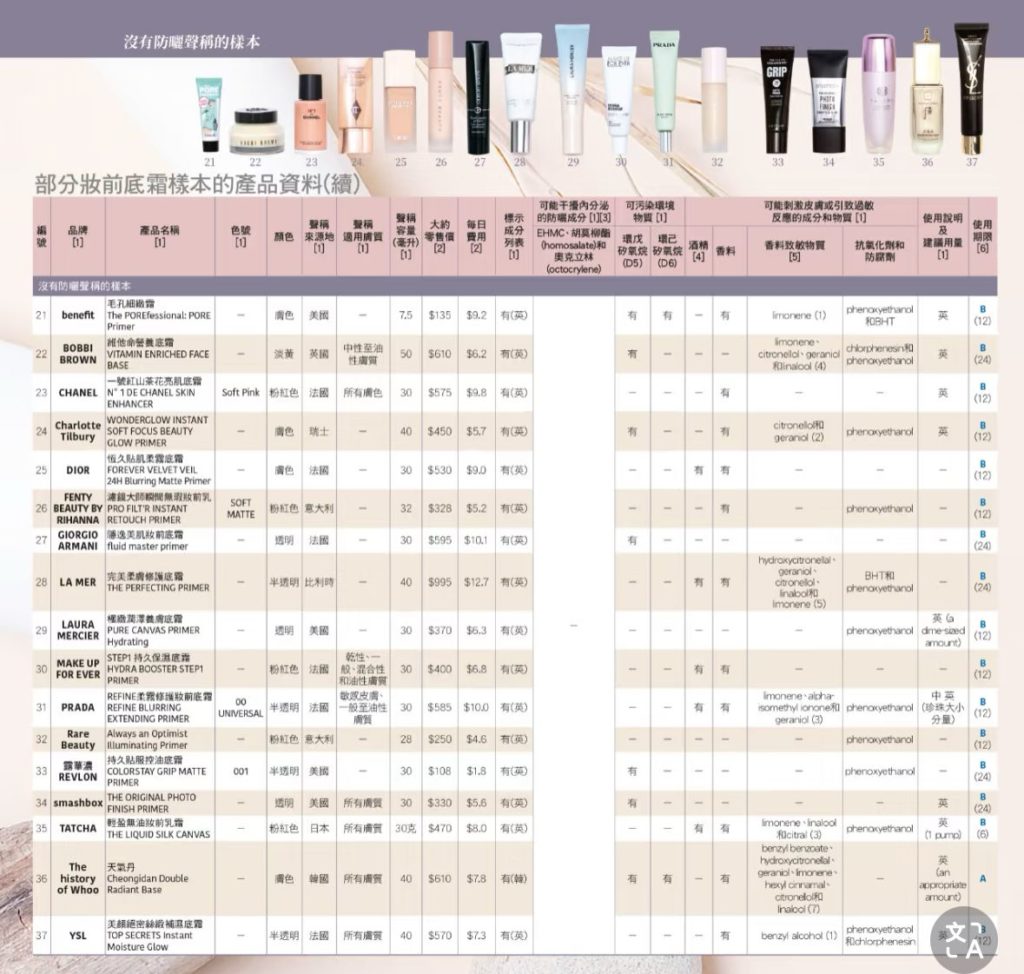 37款測試樣本中,只有「Hourglass礦物質妝前乳 SPF15」及「Giorgio Armani 隱逸美肌妝前底霜」不含可能幹擾內分泌的防曬成分,以及可能刺激皮膚或導致過敏的反應成分及物質。