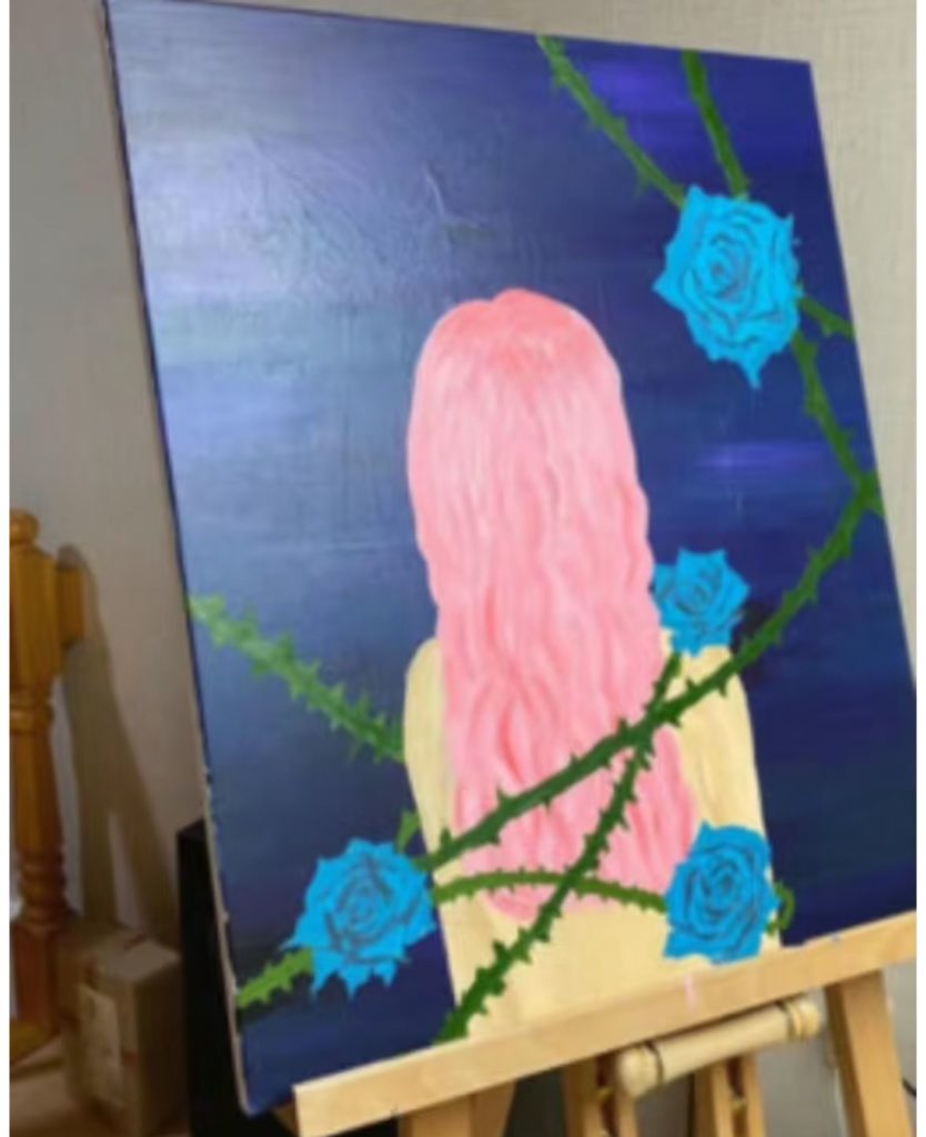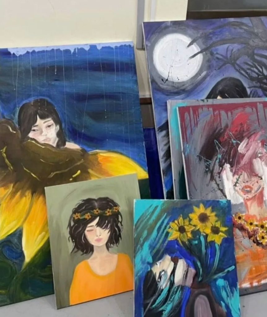 其中一幅男女相擁親吻的畫作引人注目,人物面部扭曲變形,肢體交纏處被大量黑紅色塊覆蓋,瀰漫著令人窒息的崩潰感。韓國心理專家解讀道,這種藝術表現暗示了她在親密關係中的矛盾心理——「渴望被愛又怕受傷害」。本該傳遞安全感的擁抱,在畫作中卻充滿強烈不安。此外,扭曲的臉部輪廓、暗夜背景與沉思少女等意象,都可能隱含創作者發出的求救訊號