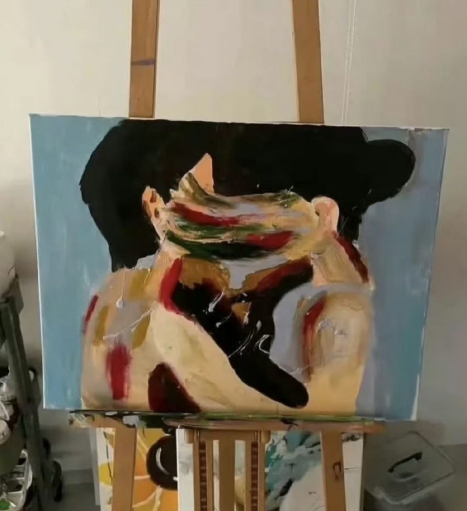 其中一幅男女相擁親吻的畫作引人注目,人物面部扭曲變形,肢體交纏處被大量黑紅色塊覆蓋,瀰漫著令人窒息的崩潰感。韓國心理專家解讀道,這種藝術表現暗示了她在親密關係中的矛盾心理——「渴望被愛又怕受傷害」。本該傳遞安全感的擁抱,在畫作中卻充滿強烈不安。此外,扭曲的臉部輪廓、暗夜背景與沉思少女等意象,都可能隱含創作者發出的求救訊號