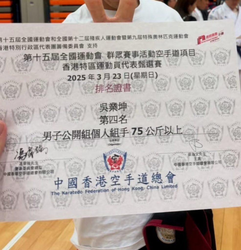 坤哥去年開始參加不同比賽,首次參加「第十三回親善空手道選手權大會」即得冠軍!至今學習空手道第5年,再次挑戰自己望做香港代表隊!坤哥在IG上載照片,曬空手道男子公開組個人組75公斤以上,港隊運動員代表選手證及排名證書。