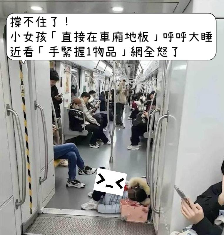 近期一組揪心的照片在社群媒體引發熱議,一名背著書包的小女生因過度疲憊,竟直接在地鐵車廂的地板上睡著了,而細看她手中緊握的東西,更是讓人看了心疼不已。