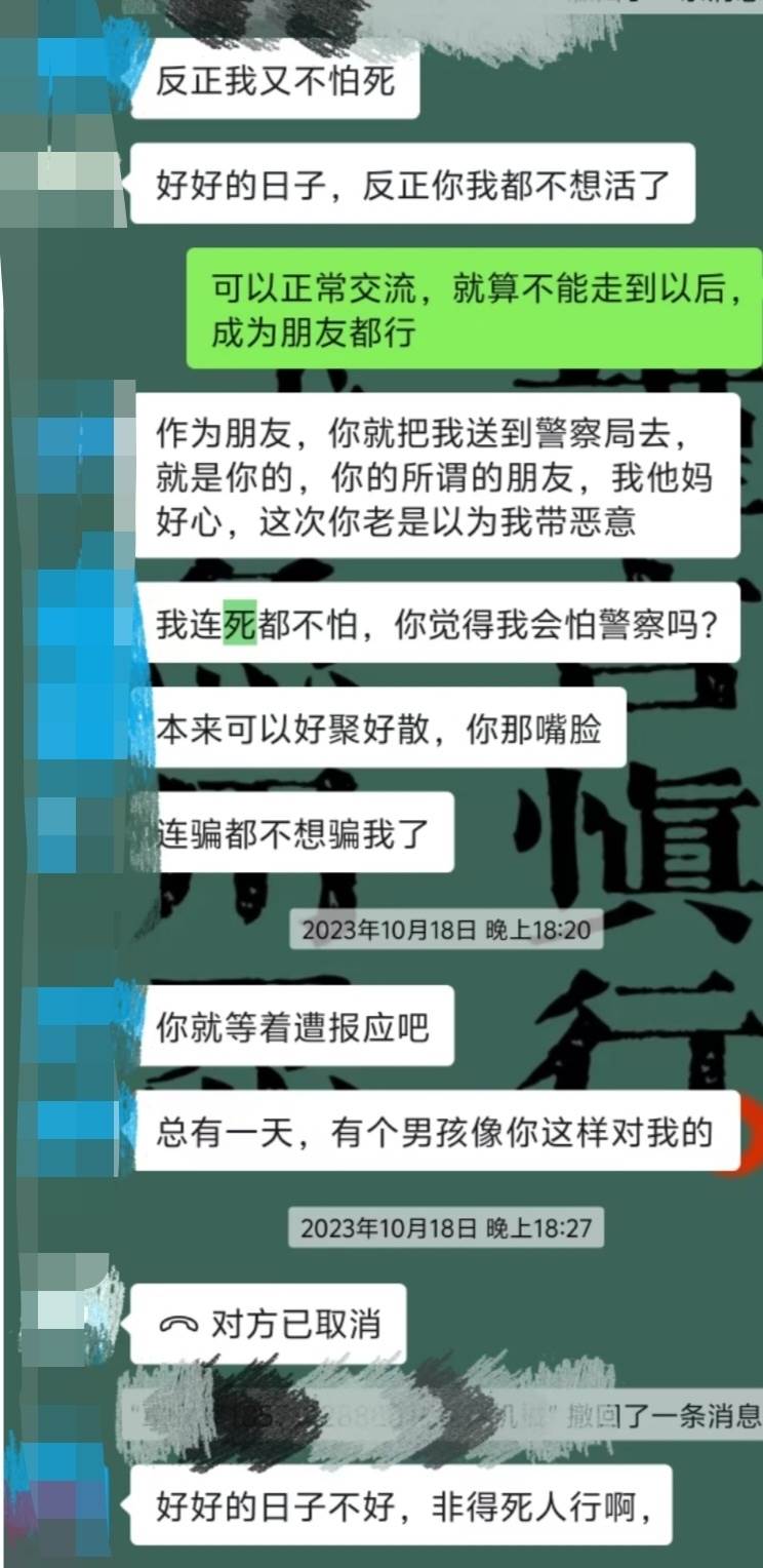 2023年10月18日,覃某某再次到陳女士公司找她,陳女士終于鼓起勇氣向恩施州白楊坪派出所報警,警方對兩人進行了調解。覃某某向警方表示,以後不會再找陳女士,沒想到當晚覃某某就給陳女士發威脅訊息,並躲在她宿舍外偷聽。