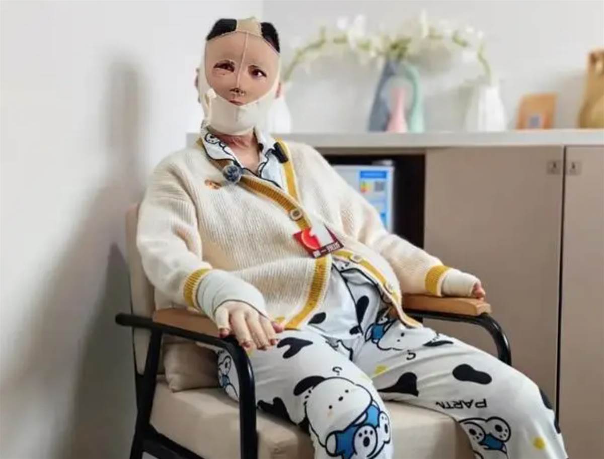 陳女士燒傷後被送入ICU病房,氣管被切開,無法說話,「我想讓他們別救我了,救回來也是重度殘障,可是我說不了話。是我的媽媽一直照顧我。她說,要是我走了她也不活了,無論我變成什麼樣,就算是成植物人,他們都要我活著。我這才慢慢有了活下去的信心。」陳女士說。之後,儘管每一次換藥都彷彿有千萬根針刺在皮膚上,躺在病床上疼得滿頭大汗,吃藥副作用導致嘔吐、拉肚子,陳女士依舊堅持治療、復健。