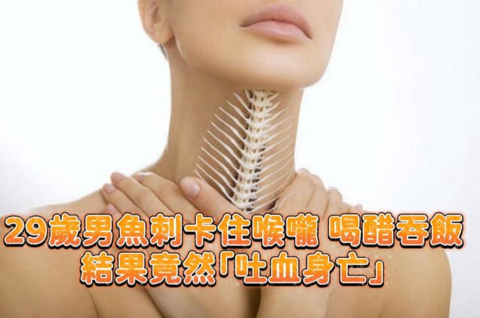 陸媒報導河南29歲男在吃紅燒魚時,不小心吞進魚刺並卡在喉嚨,他並未尋求醫師幫助,而是自行採用坊間「喝醋」偏方,還吞了幾口飯,但隔天吞嚥時仍感到明顯不適,甚至還吐出鮮血,送醫後才發現是一根5公分魚刺插在食道,而且已刺穿胸主動脈,男子大量出血,緊急開刀也來不急搶救,2天後宣告不治。