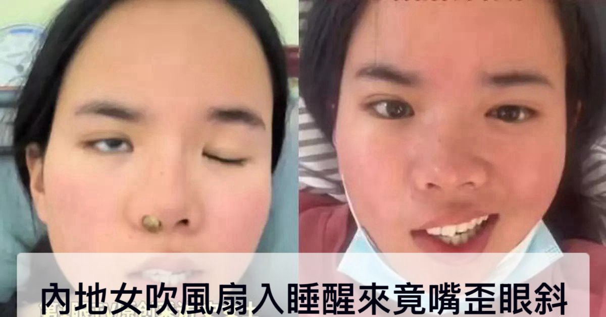 內地一名25歲女子近日開電扇午休,大概吹了三四小時後,驚覺自己竟「面癱」了,不只嘴歪眼斜,喝水吃飯都會不斷從嘴巴漏出來!