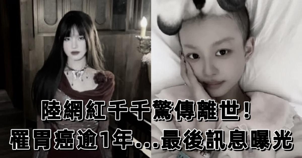 中國大陸網紅「千千」於2024年3月被診斷出罹患低分化胃腺癌晚期,但她一直以樂觀積極的心態抗癌,在社群平台記錄自己的病情與日常生活,吸引數萬名粉絲關注。今(2025)年3月千千入住安寧病房,5月24日凌晨離世,得年25歲。![]()