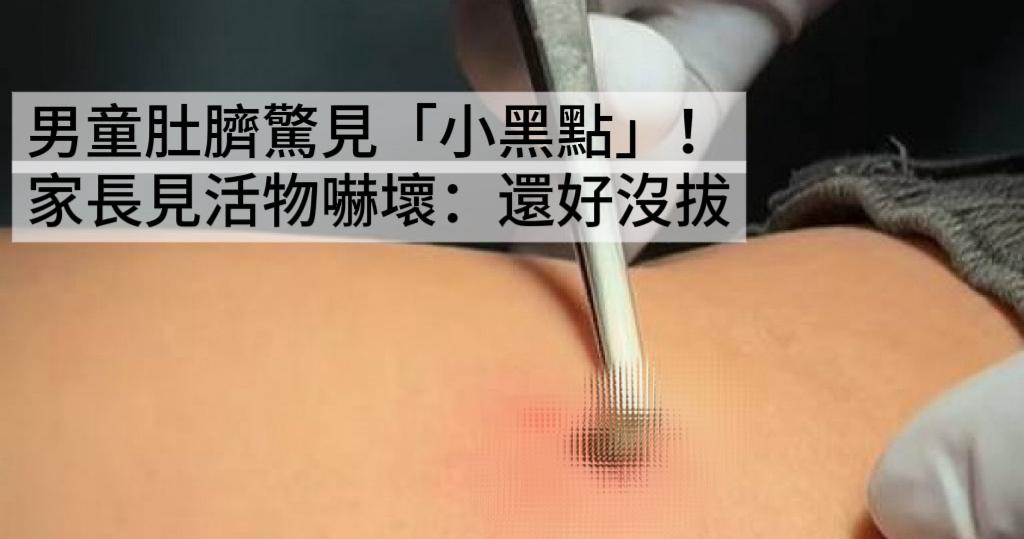 綜合陸媒報導,該名男孩近日和家人出遊,回家後肚臍眼出現黑點。媽媽剛開始以為孩子卡到髒東西,嘗試用棉花棒取出未果,直到用手電筒照亮後,才發現是活物。經過醫生的專業處理,孩子肚臍眼內的東西被取出,就是蜱蟲。家長猜測是因為接觸小動物導致,直呼「很害怕,幸好自己沒有貿然拔出來。」
