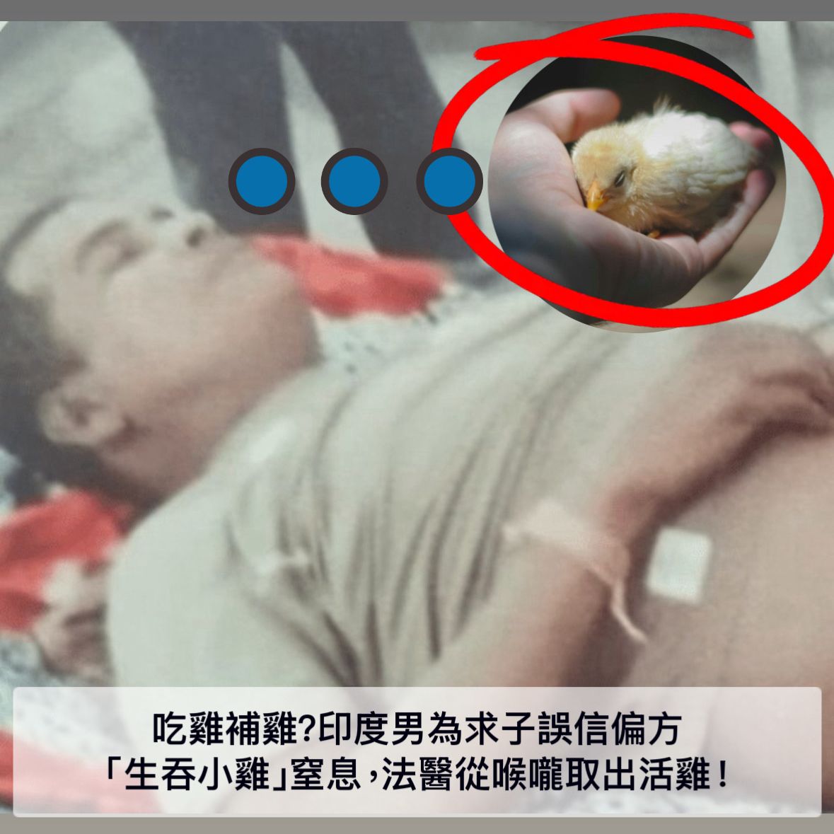 在印度有一名男子,因為求子心切而誤信偏方,將一隻活生生的小雞生吞,卻導致他因此窒息身亡,甚至驚悚的是在法醫解剖時,還從喉嚨中取出活雞!