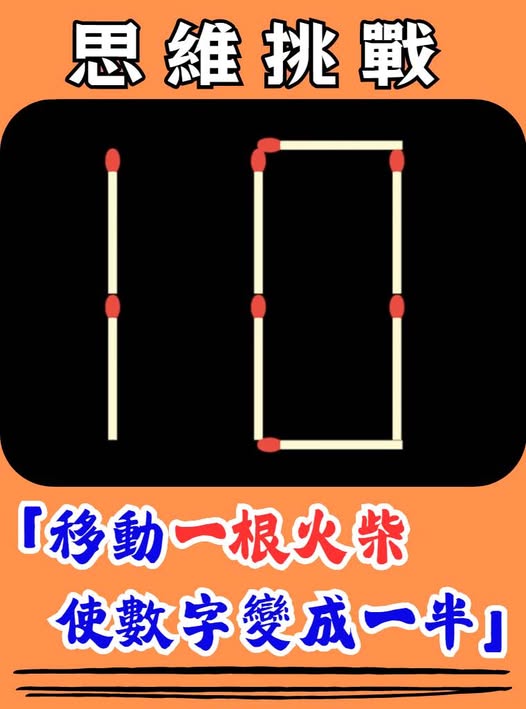 正解揭曉:最經典的解法是——將「10」中的「0」底部的一根火柴移動到「1」旁邊,重新排列成數字「5」!這樣,「10」就變成了「5」,完美實現了數字減半的目標。