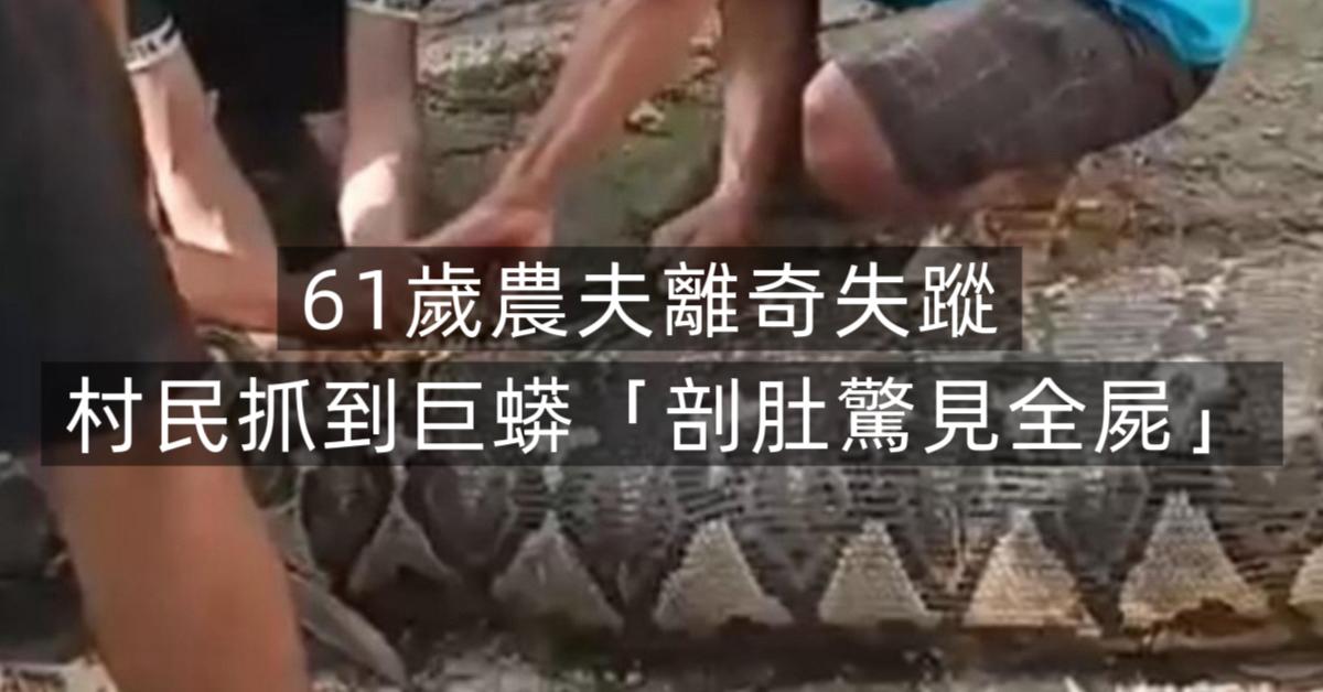 有村民懷疑巨蟒腹部隆起,可能是吞下異物,一群人聯手將其捕捉並解剖,沒想到巨蟒腹中竟是失蹤的農夫,農夫身上衣著完整、身體也完好,但他早已失去生命跡象,慘死巨蟒腹中。驚悚畫面令現場民眾尖叫聲連連,農夫的家人也相當崩潰。據悉,農夫遺體在被發現後已送回家中下葬。
