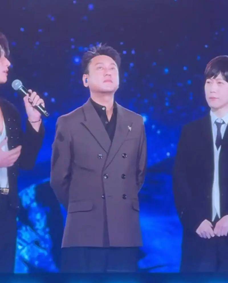 24年后,在五月天演唱會上,他穿著顏色不一致的西裝站在舞台角落。
