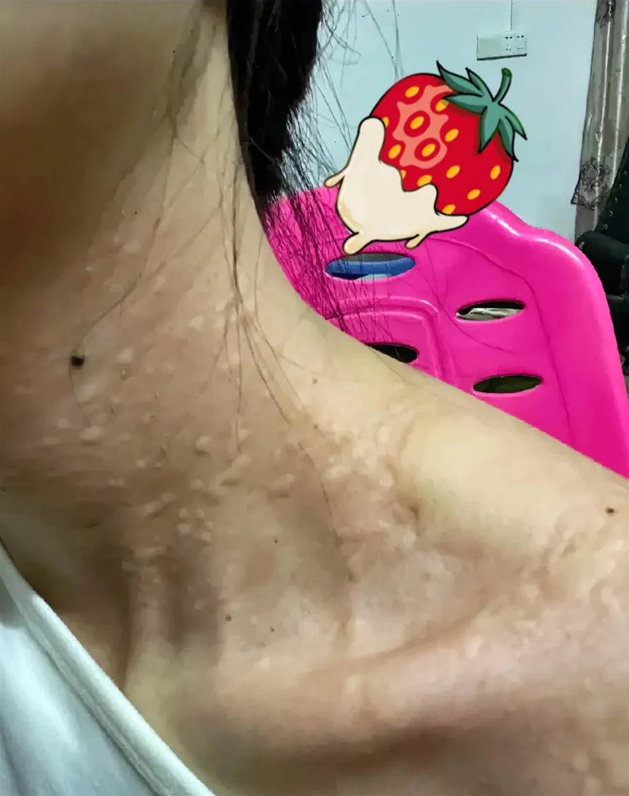 據這位網友描述,她在睡夢中的一場驚嚇——「一覺醒來脖子上長滿了疙瘩」!她在帖子中焦急地寫道:「大晚上的睡著覺,突然感覺有東西掉在脖子上,趕緊用手拍掉」。當時就感覺情況不對,