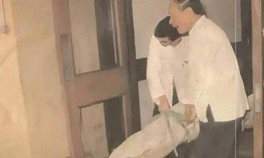 這張舊老的照片是1985年,在翁美玲的家中被鏡頭捕捉的一幕,只見兩個穿著白襯衫的男子手里抬著一個支架,而里面躺著的正是翁美玲,盡管當時有醫生第一時間救助,可為時已晚,靠里面帶著口罩的那位可能是醫生。