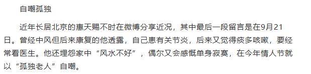 直到惠天賜的經紀人發現連續幾天都聯系不上他時,才發現不對勁,這才報警,最終發現了于家中猝死九天的惠天賜。
