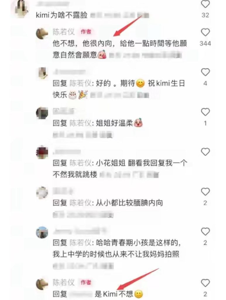 而對於網友直接在評論區提問:「Kimi為啥不露臉?」陳若儀這次沒有迴避,溫柔回應道:不是林志穎不讓,也不是孩子不好看,而是Kimi性格內向,「自己不想露」。她還暖心喊話:「給他一點時間,等他願意自然會願意。」