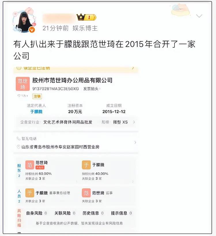 與此同時,又有網友扒出范世琦和于朦朧在2015年合開了一家公司,范世琦占股60%,于朦朧占股40%。網友認為兩人有合作開公司,說不定有利益的牽扯。