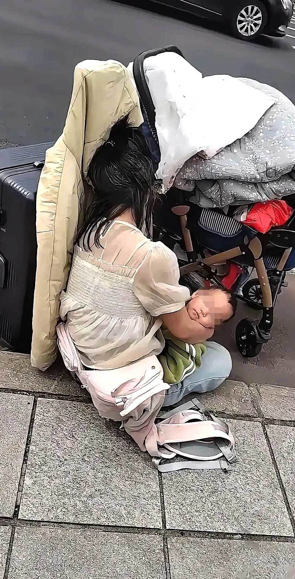 下班晚高峰,捷運口外的人潮散去,只剩路燈把人行道照得慘白。我拖著疲憊腳步,遠遠看見一位年輕母親:懷里緊緊抱著一個兩三歲的孩子,腳邊堆著鼓囊囊的行李袋,像是從外地剛下車。她蹲在地上,額頭抵著孩子的小腦袋,似乎用盡力氣不讓自己倒下。我下意識想上前搭把手,可剛邁兩步,就發現不對勁——